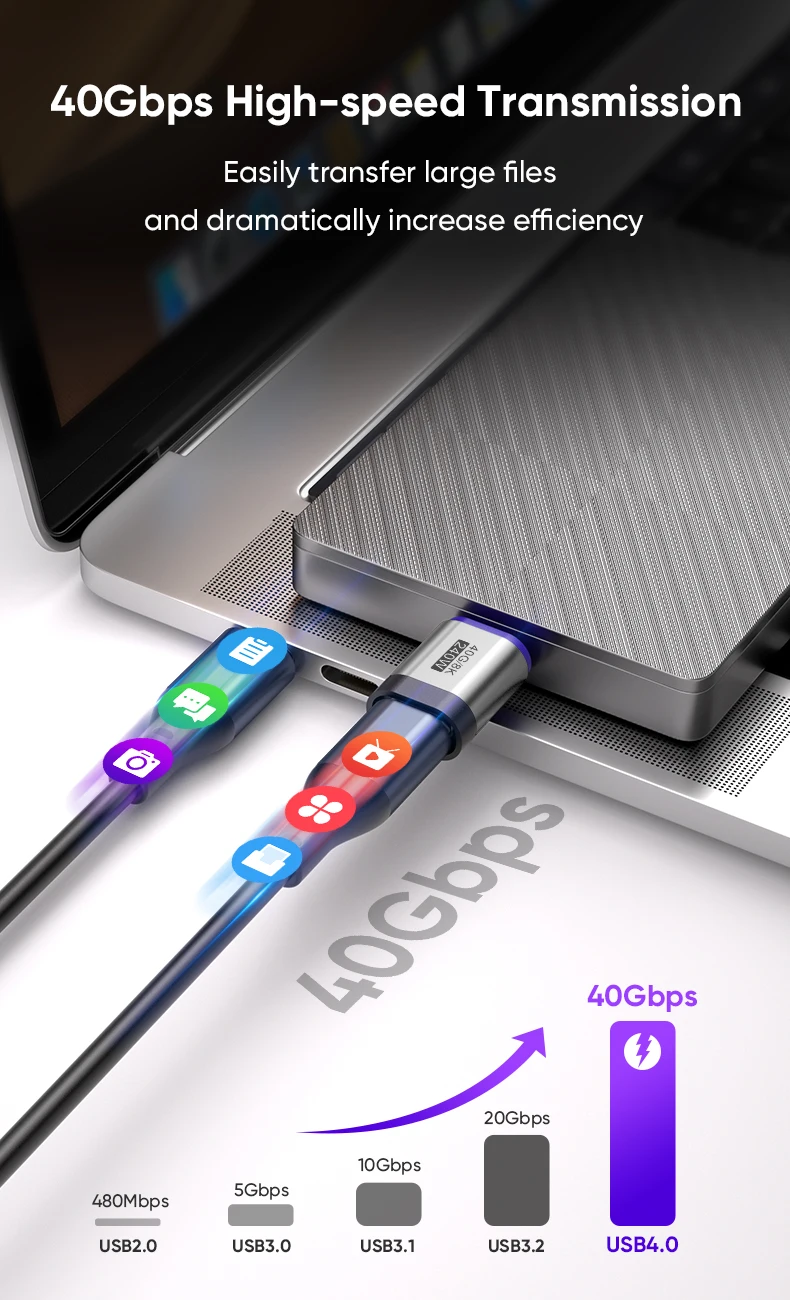 【40Gbps Data Transfer】Fully USB 4 Gen 3 standard and provide super speed syncing data at max 40Gbps,complies with USB 4 /Thunerbolt 3 & 4 is 40Gbps max., USB 3.1 is 10Gbps max.,USB 3.0 is 5Gbps max.,USB 2.0 is 480Mbps USB-C to USB-C cable.