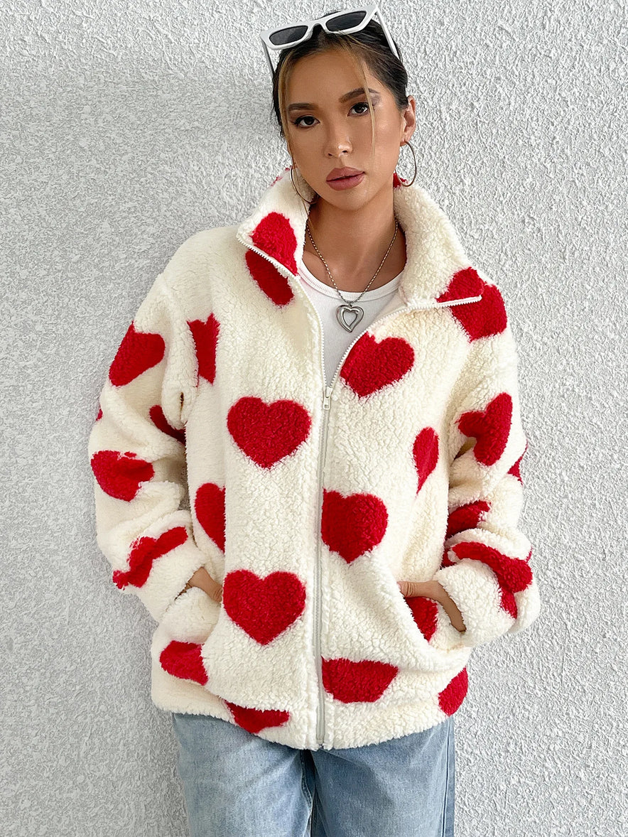Autumn Winter Women Fleece Warm Plush Zipper Love Heart Printed Jacket Casual Women Fleece Coat Clothes Women Cardigan Wears